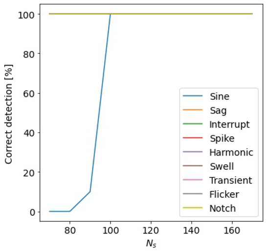 To establish the influence of the minimum number of samples of the SAW, allowing for the detection of the alteration in all cases, was varied in the range of [70, 180] samples. The signals were emulated with a superimposed white Gaussian noise with an SNR equal to 20 dB. In Figure 8, the percentages of correct detection for the different event typologies versus the number of samples are reported. The figure highlights that if the number of samples analyzed by the multi-sine fitting is greater or equal to the number of samples in a semi-period of the power signal, all the alterations are correctly detected. Therefore, increasing will not produce any advantages in the detection accuracy but will only increase the computation time. To optimize the execution of the proposed method on low-cost hardware with limited computational capability, a numerical test was designed to establish the value. A higher value of permits a reduction in the number of SAWs to be analyzed, but as said before, this can cause the missed detection of an alteration. In Figure 9 are shown the numerical results. The figure highlights that the events are correctly detected for a equal or below to 40 samples, which is about a fifth of the input signal period. Subsequently, to minimize the number of samples processed by the three-parameter multi-sine fitting algorithm and, thus, to further reduce the computational time of the detection algorithm, other considerations were made related to the sampling frequency. The sampling frequency of the IoT measurement node was chosen according to the sampling frequency required by the classification algorithm. However, the number of samples used for the detection method can be reduced without decreasing its accuracy. To obtain this result, the acquired input signal can be down-sampled with a suitable decimation factor. In this case, the number of samples in the SAW can be reduced to without changing its time duration. The numerical tests show that for equal to or greater than 100 samples and equal to or less than 40 samples, a decimation factor equal to 10 does not change the detection accuracy. A higher value of the decimation factor reduces the detection accuracy, in particular for the harmonic alteration.