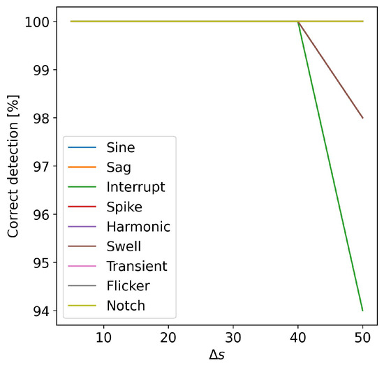 Finally, to analyze the effect of white Gaussian noise on the detection accuracy, numerical tests were performed by varying the SNR in the range of [0, 40] dB. In Figure 10 are shown the numerical results. For an SNR value higher than 10 dB, all the PQ events were correctly detected. For lower SNR values, the sinusoidal signal was not correctly recognized. This was due to the increase in the noise floor, which also increased the harmonic components of the signal.