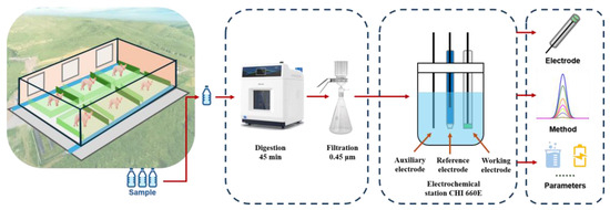 Schematic for electrochemical detection of heavy metals in pig farm wastewater.
