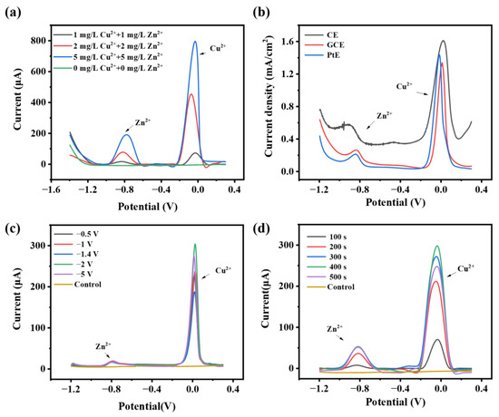 (a) Detection of different concentrations of Cu2+ and Zn2+ with DPSV using GCE. (b) Detection of 1 mg/L Cu2+ and 1 mg/L Zn2+ with different electrodes. (c) Detection of 1 mg/L Cu2+ and 1 mg/L Zn2+ under different enrichment voltages with GCE. (d) Detection of 1 mg/L Cu2+ and 1 mg/L Zn2+ under different enrichment times with GCE.