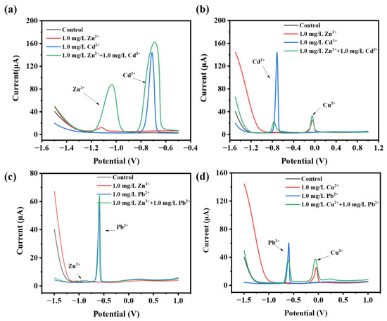 The results of DPSV with the addition of different heavy metal ions. (a) 1 mg/L Zn2+ and 1 mg/L Cd2+; (b) 1 mg/L Cu2+ and 1 mg/L Cd2+; (c) 1 mg/L Zn2+ and 1 mg/L Pb2+; (d) 1 mg/L Cu2+ and 1 mg/L Pb2+.