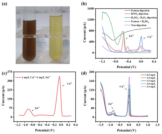 In the actual sample testing, aquaculture wastewater’s high turbidity and high organic content were not suitable for direct electrochemical detection. Samples needed to be digested to convert the metal elements’ various states and valence states to be detected into the same valence state, remove organic matter, and reduce turbidity to eliminate their interference. The main methods of digestion were wet digestion, microwave digestion, dry digestion, and electrochemical oxidation digestion. Wet digestion by using strong oxidizing acids or oxides to oxidize the substance was used here. Meanwhile, the main digestion solutions selected were concentrated nitric acid, concentrated sulfuric acid, or hydrogen peroxide. In addition, Fenton’s advanced oxidation method was also used for comparison. Figure 4a shows the representative color changes of the pig farm wastewater before and after the digestion. After filtration, the digestion process resulted in a clear solution without precipitation.
