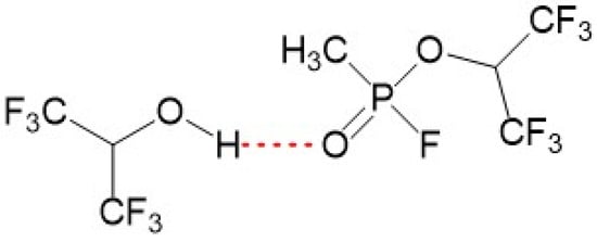 Formation of hydrogen bond between hexafluoroisopropanol (hydrogen-bonding acid—HBA) and sarin (hydrogen-bonding base—HBB).
