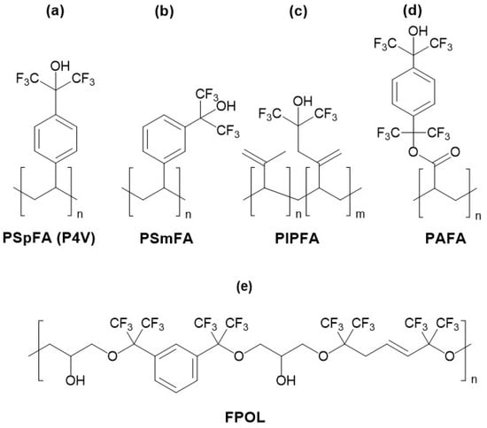 Structures of repeating units of some acidic organic polymers and acronyms used in the research papers: (a,b) hexafluoroisopropanol-HFIP modified polystyrenes (PSpFA, PSmFA), (c) HFIP modified polyisoprene (PIPFA), (d) HFIP modified polyacrylic (PAFA), and (e) fluoroepoxy resin (FPOL).