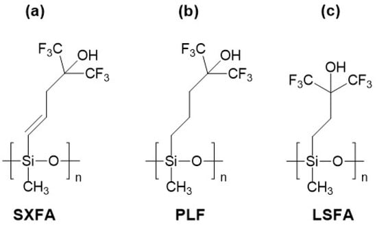 Structures of repeating units of some acidic polymers with fluoroalcoholic groups based on polysiloxane backbone: (a) SXFA, (b) PLF, and (c) LSFA.