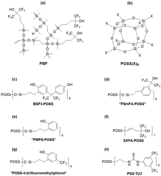 Structures of some acidic materials with branched or spatial architecture and their acronyms (acronyms in quotation marks were assigned by authors of this review due to perceived similarity to substituents of spatial materials and some compounds with linear architecture or lack of acronyms in original works): (a) branched polysiloxane with HFIP substituents (PBF); (b) polyhedral oligosilsesquioxane core (POSS) used in the synthesis of spatial analogs of: (c) BSP3 (BSP3-POSS), (d) PSmFA (PSmFA-POSS), (e) PMPS (PMPS-POSS), (f) SXFA (SXFA-POSS as well as materials containing (g) 4-(trifluoromethyl)phenol and (h) thiourea based substituent (POSS-4-(trifluoromethyl)phenol, PSS-TU3).