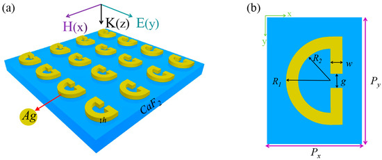(a) illustrates a schematic representation of the structure consisting of an SRR array of silver material on a CaF2 substrate. (b) Shown is the overhead perspective of a single unit cell within the SRR array, in this work; Px = 1.53 μm, Py = 2.2 μm, R1 = 0.3Px, R2 = 0.185Px, g = 0.1Px, w = 0.1Px. By adjusting these parameters, the resonant frequency and resonance characteristics of SRR array can be regulated.