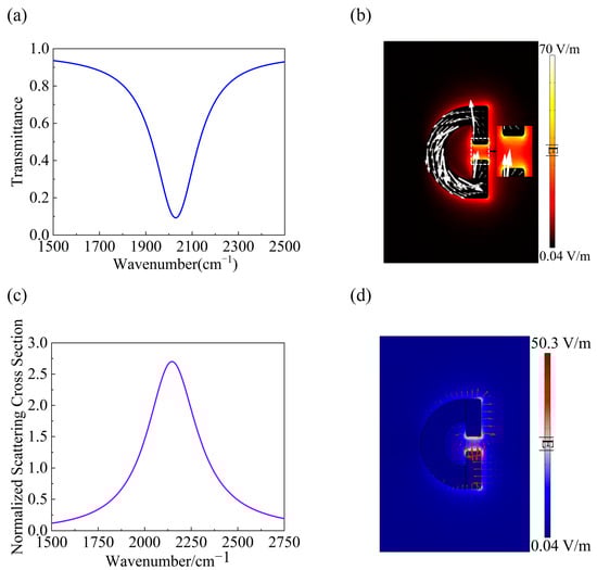 Figure 2a presents the computed transmission spectrum through the bare SRR array at a normal incidence. Our further results reveal that the resonance remains at the same frequency for inclined incidences. A significant resonance peak is observed at the wavenumber of 2037 cm−1 and the main factor preventing the resonator from reaching zero is the mismatch between losses from the silver absorption and from radiation leaking. The vectorial displacement current distribution across the xy cross-section at the resonance is depicted in Figure 2b. It is observed that the displacement current forms a sharp contrast between the left and right sides of the structure, with its flow direction completely opposite. This particular current-distribution pattern is fully consistent with the typical circulating characteristics of a MD [30]. Jie et al. utilized the MD resonance in a single silicon antenna and demonstrated significantly enhanced interactions between MIR light and nano-molecules, providing a strong proof for the contribution of MD resonance in MIR sensing [31]. For the resonance peak, the amplitude of the electric field is shown in Figure 2b. Remarkably, the amplitude of the electric field shown in Figure 2b can reach a maximum enhancement factor of 70 (the incident plane wave has an electric field of 1 V/m), which is a very promising result in the case of metals. Through detailed calculations, we found that the width of the arc-shaped part of the SRR is important to achieve the strong coupling between SRR and PMMA molecular vibrations. To highlight this point, in the next step, we decreased the value of R2 to 0.155Px and calculated the normalized scattering from individual SRRs instead. The scattering cross-section can be understood as the ratio between the number of photons scattered by the structure normalized to that in the incident light, and it can be calculated by the following [32]: