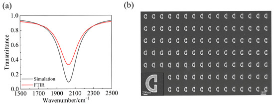 We further fabricated the design structures and conducted some experimental investigations. We first performed a fine cleaning of CaF2 by using an ultrasonic bath first in acetone and then in ethanal to ensure that the no impurities and organic matters are remaining on the CaF2 surface. After a spin coating of PMMA (950 A4) at a precisely controlled rotation speed of 4000 rpm and subsequently baking the sample at 180 °C for 90 s, a uniform layer of about 200 nm thick PMMA was created. The sample was then loaded into a piece of electron-beam lithography (EBL) equipment (Raith Voyager, Dortmund, Germany) for the exposure. After developing, the sample was placed into the electron-beam evaporation (EBE) chamber. A vacuum condition below 3 × 10−6 Torr was used when the Ag was evaporated onto the sample at a coating rate of 0.5 Å/s to ensure the uniformity and quality of the coating. A final lift-off process in acetone helped to transfer the pattern in the electron-beam resist to the Ag layer, and the final arch-shaped SRR array structure was obtained. To reduce the influence of silver oxidation to the optical properties, the sample of a fabricated SRR array was loaded after fabrication into a vacuum type of Fourier transform infrared spectrometer (FTIR) (Bruker Vertex 80 V, Bruke Technology Co., LTD, Littleton, MA, USA) for the characterization of the transmission spectrum. The measurement was performed under normal incidence conditions with the help of a linear polarizer to make sure the incident line was y-polarized. The measured transmission spectrum is shown by the red solid line in Figure 3a, which exhibits a clear transmission dip at around 2028 cm−1. For comparison, we also presented using a black line in Figure 3a the result of transmission spectrum obtained from numerical simulations. It can be seen that a good agreement exists between experimental and theoretical results. The minimum measured transmittance of 0.3 is attributed to the additional optical losses stemming from manufacturing imperfections such as the unsmooth side walls of our SRR structure. Specifically, in the numerical simulations, the structural side wall was set to an ideal vertical state with no roughness. However, in the actual manufacturing process, some roughness may occur during the lift-off process. In addition, the slight oxidation of the silver material may also contribute to the slight discrepancy between the numerical and experimental results. Figure 3b displays a top-view Scanning Electron Microscope (SEM) image, revealing the fabricated quality of the SRR array.