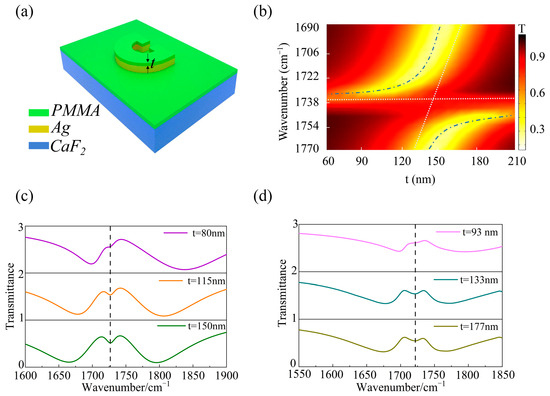 Experimental characterization and theoretical simulation of the strong coupling effect at different thicknesses of PMMA films. (a) Schematic setup of the model showing the strong coupling phenomenon observed at the presence of PMMA films. (b) The transmission spectrum as a function of the coated PMMA thickness. (c) The calculated transmission spectrum at normal incidence, considering three different thicknesses of the PMMA layer (t = 80 nm, 115 nm, and 150 nm). (d) Transmission spectra for different thicknesses of PMMA layers spin-coated on the SRRs structure, measured using FTIR. The vibrational resonance positions of PMMA molecules are marked by the black vertical dashed lines in (c,d).