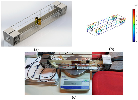 Figure 3a illustrates the digital mockup of the EMCU connected to the EHCU. Axial compression of the composite piezoelectric beam was achieved by means of a mechanical assembly consisting of a compression mechanism and its supporting steel frame. The mechanism includes a μm-resolution thread screw and sheet metal clamps assembled with screws in tight tolerance with the frame. The frame was designed by means of finite element analysis to safely endure the compressive reaction loads with acceptable deformation (Figure 3b). It was manufactured using laser cutting and sheet metal forming. The design strategy encompasses the tuning of the concentrated mass placed symmetrically at the center of the beam to achieve the desired power output and weight requirement. Each mass part weighs approximately 72 gr. By placing two mass parts, a weight of 1134 gr was achieved, as shown in Figure 3c.