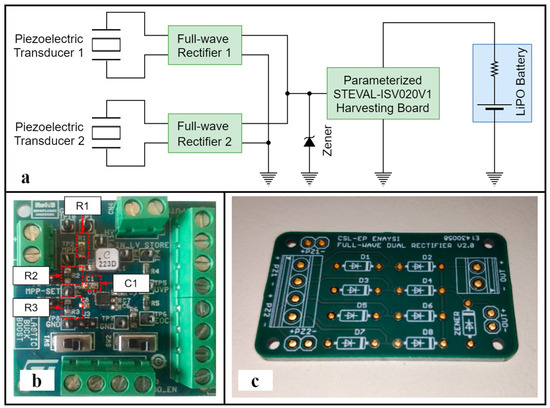 A schematic representation of the EHCU architecture is shown in Figure 4a. The unit integrates a single SPV1050-based harvesting board (Figure 4b) from STMicroelectronics (Geneva, Switzerland) in order to minimize power losses attributable to the SPV1050 self-powering requirements. Two piezoelectric transducers are connected to the harvesting board via dedicated full-wave rectifiers (Figure 4c). The output stage of the rectifiers was parallelized, adding the electric power contributions of each individual piezoelectric transducer and distributing them to the harvesting board. Moreover, a BZX85C18-TR Zener diode with a breakdown voltage of Vz = 18 V was added to protect the harvesting board from overvoltage. In the final stage, a LiPO battery was connected to the harvesting board’s output. The harvesting board was parametrically tuned by setting the values of the electronic components according to the recommendations in the manufacturer’s datasheet while taking into account the electrical characteristics of the piezoelectric transducer output (Table 2).