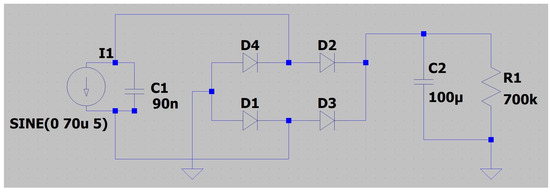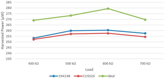 The full-wave rectifier circuit was simulated using the LTspice XVII (v17.0.27.0) by Analog Devices Inc. (Wilmington, MA, USA) software in order to select the most appropriate diode for the studied blade monitoring application. The piezoelectric transducer was modeled as a sinusoidal current source with an amplitude of 70 uA and a frequency of 5 Hz. A schematic representation of the simulated system is shown in Figure 5. The output (harvested) mean power was measured for a varied load of 400 kΩ, 500 kΩ, 600 kΩ and 700 kΩ. The efficiency of two widely used diodes, 1N4148 and CUS520, was investigated and compared against the efficiency of an ideal diode. The results presented in Figure 6 demonstrate that both diodes are by far inferior in comparison with an ideal diode. Concerning the commercially available diodes, the circuit based on the 1N4148 diode is the most effective for the particular application, exhibiting a maximum output power of 260.38 uW and an efficiency of 92.6% in the case of a 600 kΩ load.