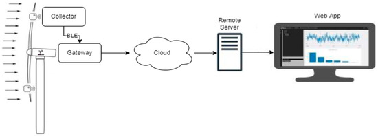 The DAWTU subsystem comprises two physical devices, the collector and the gateway. Its role is to acquire measurements from piezopolymer sensors for strain monitoring and transmit this data to the remote user for additional analysis and visual representation via a web application, which was also developed in-house. The design of the DAWTU subsystem, both its hardware and its embedded software, is based on the PrismaSense™ technology [42], which was upgraded to serve the aforementioned functionalities. The collector is powered from the PEH subsystem via a battery; it is placed inside the wind turbine’s blade, and it interfaces with two types of piezopolymer sensors: 2× DT1-028K [43] for measuring the strain and 1× MiniSense 100 [44] for the acceleration. Thus, it samples data crucial to the blade’s fatigue under a predefined rate and wirelessly transmits the information to the gateway. The latter, which is placed inside the nacelle of the wind turbine and is connected to the power and network structure of the wind energy park, is responsible for the reception of the sampled data sent via the collector and its proper forwarding to the cloud. A web application, the presentation of which exceeds the scope of the present manuscript, takes over the role of information processing and visualization in a user-friendly way. The architecture of the system is displayed in Figure 7.