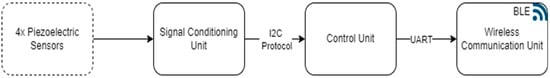 A deeper understanding of the DAWTU subsystem can be obtained by delving into the architecture and the modules comprising the devices that the DAWTU subsystem consists of. The collector device constitutes three sub-modules, namely the following: (a) the Signal Conditioning Unit (SCU), which amplifies, properly filters and converts the analog signal (under a constant frequency) into a digital one—thus, it is responsible for interfacing with the sensors; (b) the Control Unit (CU) which is responsible for configuring the functionalities of the collector, setting the sampling frequency (implemented via the SCU), activating the WCU when the memory usage has reached a critical level, safely transmitting all necessary information to the WCU, restoring the sampling functionality, monitoring the battery level and deactivating the WCU when the wireless transmission of the data from the WCU is completed in order to minimize the power consumption; (c) the Wireless Communication module (WCU) that is charged with the proper formatting of the data and their wireless transmission via a Bluetooth Low Energy (BLE) protocol. In Figure 8, the architecture and the data flow between the collector’s submodules are depicted in a block diagram format. By employing this architecture, data from the piezoelectric sensors are collected and transmitted via the collector in two distinct phases: a data collection phase, during which data from the piezoelectric sensors is acquired at the Control Unit via the Signal Conditioning Unit and are temporarily stored before being transmitted to the gateway. This process lasts approximately 146 s in order to acquire data from three sensors at a sampling rate of 100 Hz. Consequently, the transmission of the collected data to the DAWTU’s gateway is accomplished within 20 s at most. After the data transmission has been accomplished, the data acquisition phase starts again. Therefore, the DAWTU does not operate in real time.