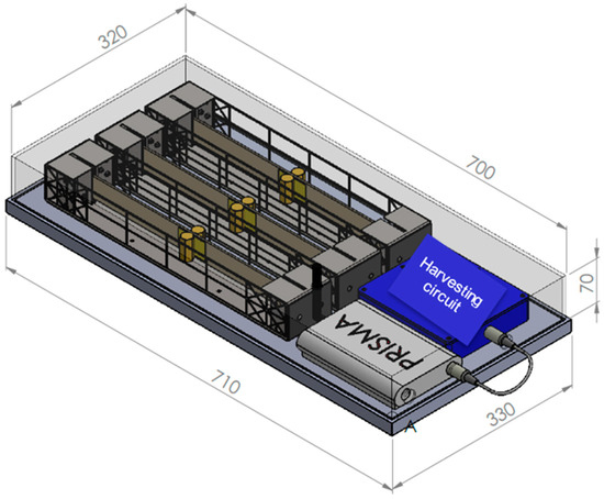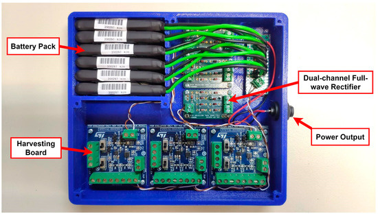 The harvesting circuit sub-assembly integrates three sets of dual full-wave rectifiers (Figure 4c) along with a harvesting board (Figure 4b). Each set is responsible for capturing energy that is produced via a pair of DuraAct P876.A11 transducers and saving it to an incorporated custom battery pack. Six single-cell lithium-polymer (LiPO) batteries in a parallel configuration are used. The nominal terminal voltage of the battery pack is 3.7 V, reaching a total nominal capacity of 5700 mAh. The housing was designed and developed in-house in order to facilitate assembly operations and protect the electrical components from dust and other environmental hazards (Figure 12). The harvesting circuit subassembly ensures the constant operation of the entire system for a minimum of 30 days; the harvested energy gain is not considered. The powering of the DAWTU subsystem is realized through a 2-pin circular connector. The assembled subsystem, excluding the top cover, is presented in Figure 13.