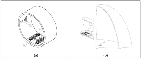 The placement of all the subsystems is displayed in Figure 14. All subsystems except the gateway are fixed inside the blade section to ensure stability during vibration. The EMCUs must be placed away from the root of the blade so that the amplitude of the blade’s oscillation is greater, resulting in larger amounts of energy being harvested. It is also important that they are placed vertically to the length axis of the blade and the plane of the blade’s rotation to harvest the energy from the fundamental bending mode of the blade. In Figure 14a,b, the wind turbine blade installation of an EnAuSy configuration with two EMCUs is shown. The harvesting circuit sub-assembly and the collector of the DAWTU subsystem are placed in close proximity to the EMCUs so that the energy losses in cabling are minimized. The measuring sensors can be installed at different locations to maximize their effectiveness, depending on their type. The gateway is installed in the nacelle of the wind turbine so that it can be connected to the turbine’s network infrastructure while still being able to receive the data from the collector through BLE.
