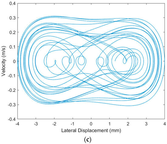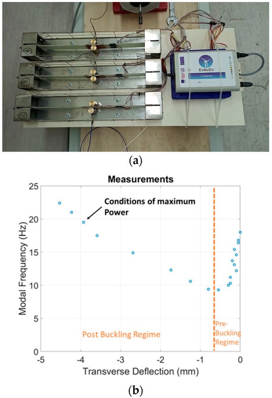 For the particular application of monitoring the wind turbine blade, the harvesting subsystem demonstrator includes three independent EMCUs, as shown in Figure 15a. Independence here is related to the design choice of each pair of DuraAct transducers connected to its own dual-channel full-wave rectifier as part of the harvesting circuit subassembly. Previous simulations and tests on similar composite piezoelectric beams [38] quantified the required prestress to get the composite beam deep in post-buckling to harvest the maximum vibration energy. Due to the absence of a static load cell capable of measuring the axially generated load on the specimen, the only way to identify the ideal prestress level on each specimen remained the first bending modal frequency variation as a function of the resulted lateral specimen displacement due to the applied axial load via the micrometer screw. The pre-loading procedure was performed independently for each of the EMCUs that was mounted on the aluminum platform, which laterally oscillated via the electromechanical shaker with white noise excitation in the range of (0–200) Hz with simultaneous acquisition of the specimen acceleration. Using the measured acceleration and the applied dynamic load from the shaker, the FRFs were extracted. Loading towards buckling was performed stepwise, based on the lateral displacement generated at the specimen center as the axially applied displacement slowly increased. This procedure, which may be, thus, characterized as a “tuning” procedure of the EMCU, serving the identification of the most promising prestress levels for highest power extraction, is illustrated for one of the EMCUs in Figure 15b. Additionally, Figure 15c demonstrates a simulated phase plot of the beam response, aiming to highlight the specimen’s bistable behavior and nonlinear vibration at the post-buckling regime. The simulation refers to 8 Hz tonal excitation and a 60μm axial compressive displacement, resulting in a 13.1 Hz first bending modal frequency on the specimen. The ideal prestress “tuning” process led to fundamental eigenfrequencies of 11.0 Hz, 15.47 Hz and 17 Hz for each EMCU beam specimen, respectively, depending on the precise individual boundary conditions and tolerances of each unit.