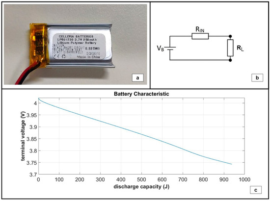Given the characteristic curve of the battery, i.e., the terminal voltage as a function of the discharge capacity, mean electric power estimations could be carried out based solely on terminal voltage measurements. For the ground tests, the battery pack of the harvesting circuit subassembly was replaced with a single-cell, low-capacity LiPO battery in order to accelerate the power measurements. The battery used is shown in Figure 16a, and it is characterized by a nominal terminal voltage of 3.7 V and a nominal capacity of 250 mAh. To determine the characteristic curve of the battery, a phenomenological model was developed for the operation of the battery under a known constant load, RL, as shown in Figure 16b. The battery was modeled as a constant voltage source, VB, in series with an internal resistor, RIN. The resultant characteristic curve is presented in Figure 16c.