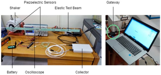 The experimental setup for the DAWTU subsystem is visually presented in Figure 17 and schematically represented in Figure 18. The test setup included the tonal excitation of a cantilever epoxy test beam via a second electromechanical shaker, as this testing campaign was performed simultaneously with the harvesting subsystem ground tests. The pure resin specimen (1 m long) was selected for this application, as it was very compliant, providing a high oscillation stroke in low frequency ranges, resulting in a high voltage level on the piezopolymer sensors. Two pairs of piezoelectric sensors were placed on each side of the beam. Data from one or two piezopolymer sensors were acquired via the collector and sent to the remote server via the gateway. The sampled data from the collector and the data sent to the server via the gateway were recorded on a computer. The logged data from each device were then compared to each other and to the data from the sensors for verification purposes. Finally, the data acquired from the integrated system (piezopolymer or battery-related) were monitored via a web application. In particular, the raw and/or elaborated data are offered to the remote user in a visual way, as can be seen in Figure 19.