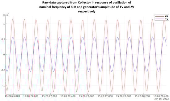 Zooming in on the response signal (raw data) as captured via the collector device to an oscillation of a nominal frequency of 8 Hz and the generator’s amplitude of 1 V and 2 V, respectively.