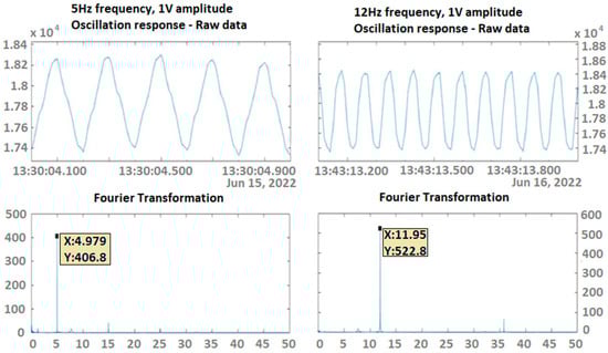 Fourier transformation to determine the main frequency of the recorded signal from the collector when the elastic test beam is subjected to forced harmonic excitation under a 1 V amplitude of shaker voltage at a frequency of 5 Hz (left) and 12 Hz (right).