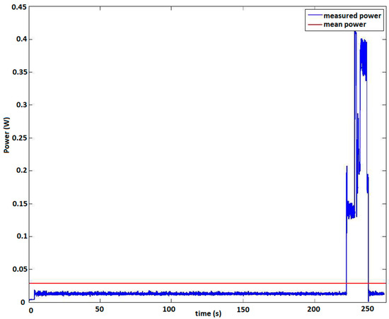 Apart from those tests, which mostly demonstrate the performance quality of the DAWTU, tests were also performed to record the power consumption of the subsystem since it is the one that is powered via the PEH, and thus, little consumption is desired. A typical instance of the power profile during the different phases of operation (e.g., sampling, wireless transmission, etc.) in one full cycle of operation (from the initiation of operation until the first wireless transmission of all collected data to the gateway is completed) is presented in Figure 23. The power consumption of the collector presented in this figure corresponds to the power drawn from the collector in order to acquire data from three sensors for a sampling duration of 146 s at a sampling rate of 100 Hz and to transmit the collected data to the DAWTU’s gateway, which is accomplished within 20 s at most. The data transmission process is the most demanding phase in terms of power, as can be seen in Figure 23. The mean value of power required for the entire process under typical operating conditions was estimated to be 32 mWatt. As soon as the wireless transfer of data is complete, the wireless data-transferring unit is deactivated, and the data acquisition process restarts.