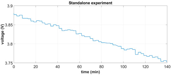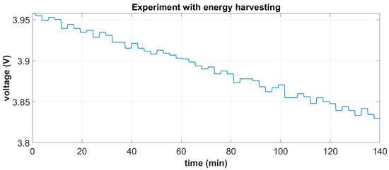 The integrated system is shown in Figure 15a. It was tested under white noise excitation in the range of [0–20] Hz and a 1 g base acceleration, which is considered representative of a typical operational state near the mid-span of a 55 m blade at windspeeds of 10 m/s. Based on the derived battery characteristic curve, mean harvested power estimations were carried out by measuring the battery’s terminal voltage in two independent tests, each one lasting for a duration of approximately 2.5 h: (i) a standalone battery autonomously feeding the DAWTU and (ii) a battery feeding the DAWTU while being continuously supplemented with the electromechanical subsystem. A comparison of the two tests indicates the reduction in the total power consumed, which actually is the harvested power contributing to the operation of the DAWTU. In Figure 24 and Figure 25, the battery terminals’ voltage is respectively shown for the two independent experiments.