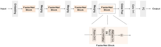 As depicted in Figure 3, within each unit of FasterNet, an architectural ensemble comprising one PConv and two PWConv configurations is observed. These units are pivotal in the neural network’s architecture, with normalization and activation layers playing critical roles. Within the ambit of each FasterNet module, the dual PWConv layers are synergistically paired with Batch Normalization (BN) and Rectified Linear Unit (ReLU) layers. The integration of BN not only expedites the training process but also enhances the model’s accuracy. Concurrently, the ReLU layer serves as a catalyst, fostering a swifter learning curve for the model while mitigating the risk of gradient vanishment. Strategically positioned between the PWConv phases in each FasterNet unit, the normalization and activation stages strike a harmonious balance, ensuring both efficiency and the preservation of functional integrity.