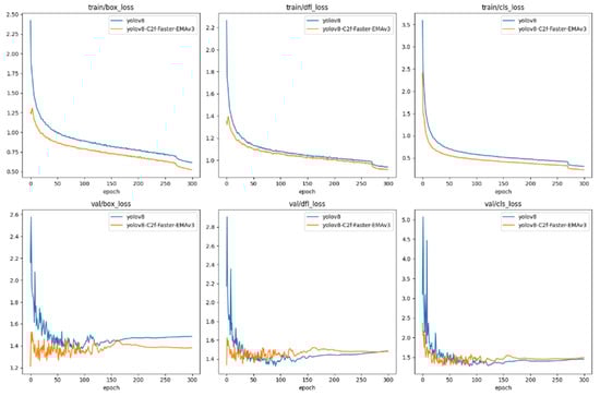 As delineated in Figure 11, the loss trajectories articulate the comparative performance of two object detection models: the canonical YOLOv8 and its augmented counterpart, YOLOv8-C2f-Faster-EMAv3, across the spectrum of training and validation phases. These phases interrogate different loss dimensions: bounding box accuracy, object detection confidence (‘df1’), and category classification (‘cls’).