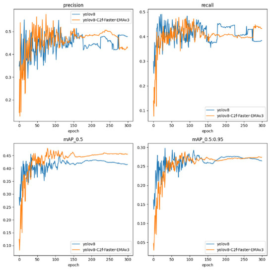 The Precision trajectory, a gauge of the veracity of positive detections, reveals the YOLOv8 model’s fluctuating yet generally stable trend. In contrast, the YOLOv8-C2f-Faster-EMAv3 evidences an ameliorated Precision, particularly manifest in the latter epochs, signaling its honed proficiency in rendering accurate detections.