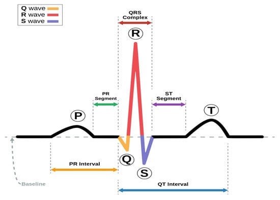 - Atkielski, A. Schematic Diagram of Normal Sinus Rhythm for a Human Heart as Seen on ECG (with English Labels). Available online: https://en.wikipedia.org/wiki/Electrocardiography#/media/File:SinusRhythmLabels.svg (accessed on 1 August 2023).