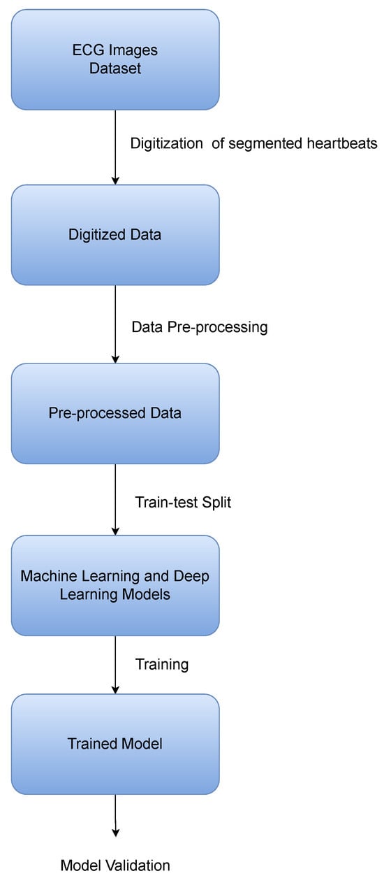 Our main focus in this study is to train machine learning and deep learning models on a digitized form of the CPEIC cardiac dataset. All of the existing approaches implemented on this dataset use models directly on images, which hinders the use of techniques that are applied to time series data, such as MIT-BIH. Secondly, there are some important cardiac arrhythmia classes in the CPEIC cardiac dataset, but the dataset is available only in image format, so converting it to a time series format gives us a numeric dataset with those cardiac disease classes. In the following section, the proposed approach is discussed in detail for classifying cardiac diseases on the digitized form of the CPEIC cardiac dataset using both machine learning and deep learning techniques.