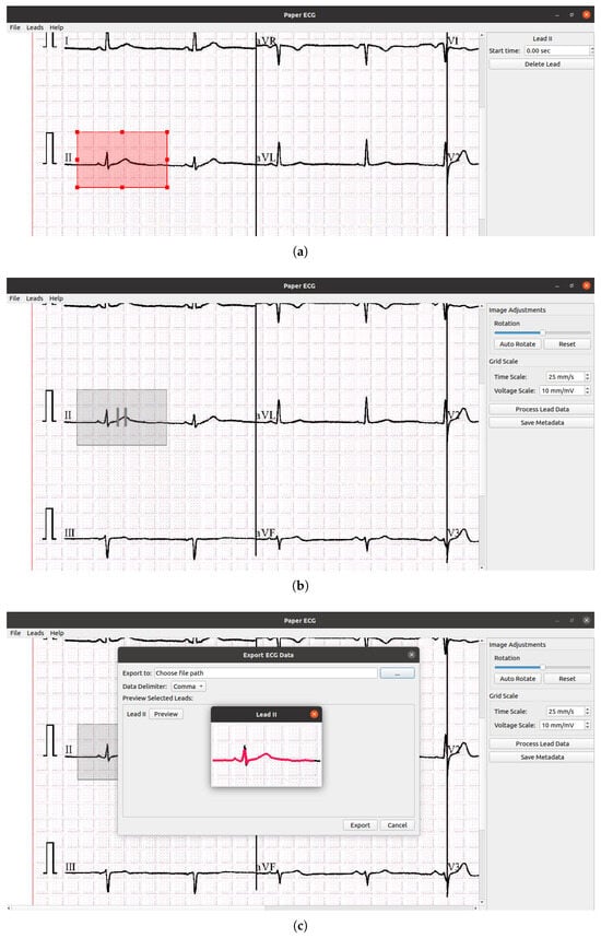 ECG digitization using ecg_digitize. (a) Select the lead II heartbeat for digitization. (b) Adjust the image if tilted. Set the time and voltage, then process. (c) Export the digitized ECG heartbeat in a CSV file.