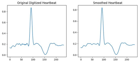 In some of the digitized signals, there were noise or jittering at some points. This could be due to blurry images or some noisy pixels. A Savitzky–Golay smoothing filter [47] was applied to make the signals smoother. There are many other methods for data smoothing, such as Gaussian smoothing and exponential smoothing, but the Savitzky–Golay filter performs local polynomial regression on the data, allowing it to capture more complex trends and patterns. It also preserves the shape of the signal better than other smoothing operations, especially when the data contain sharp edges or sudden changes. Figure 7 shows the comparison of a digitized heartbeat before and after applying the smoothing filter.
