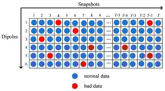 As presented in Figure 2, the received data of the t-th snapshot in is the matrix . Assume that the m-th sensor fails in the t-th snapshot, no useful observation data can be obtained except for internal system noise. Meanwhile, bad data will likely be received due to hardware imperfections. Therefore, random noise and bad data are included in the m-th row entries of the matrix . In general, the absolute value of the bad data in the column is much larger than the average of the summed absolute values of the entries in the same column. As a result, the proposed CVD method allows for each column of the matrix to be traversed and the positions of bad data to be marked as: