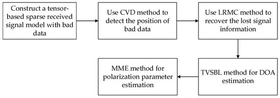 The rest of the paper is organized as follows. A tensor-based sparse signal model with bad data is presented in Section 2. Section 3 presents the proposed method for the joint DOA and polarization parameter estimation. Section 4 explores the Cramér–RAO bound for parameter estimation with partially impaired sensors. Section 5 provides the computational load of the proposed method. Section 6 shows the simulation results. Finally, the conclusions are presented in Section 7.