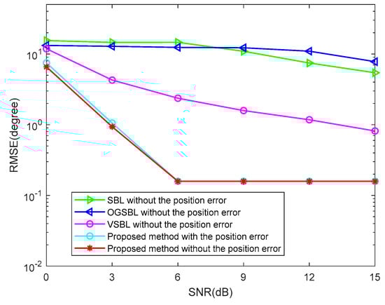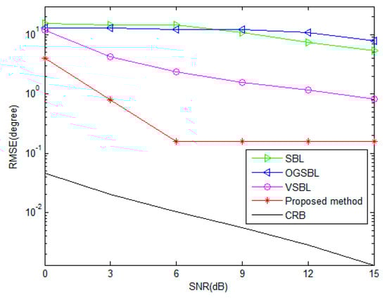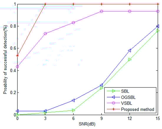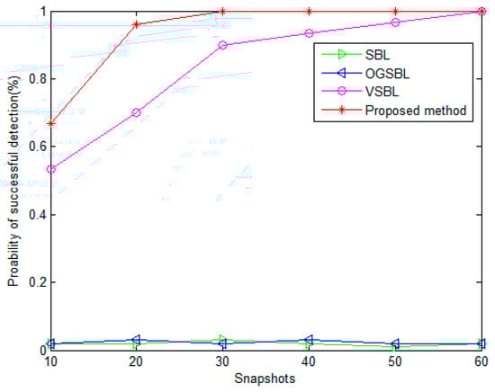 Figure 9 and Figure 10 present the probability of the successful detection (PSD) performance versus SNR, and the number of snapshots, respectively. In Figure 9, the number of snapshots is fixed to 20. In Figure 10, the SNR is set to 3 dB. The other parameters remain the same as before. In this simulation, the definition of one “successful detection” is illustrated in Section 6.1. It is shown that the PSDs of SBL and OGSBL are rather low when the SNR is lower, or the snapshots are smaller. Especially in Figure 10, when the SNR is 3dB, although the snapshots are increasing, the SBL and OGSBL algorithms still fail to distinguish the two emitting signals. Compared with SBL and OGSBL, the VSBL and the proposed method possess higher PSDs, which means that the resolution of the two algorithms is much higher. As expected, the resolution performance of the proposed method is the best; the PSD curve of the proposed method is much higher than that of the VSBL, even with a relatively lower SNR and smaller snapshots. Figure 9 and Figure 10 further verify that our proposed method is robust to bad data in sensors.