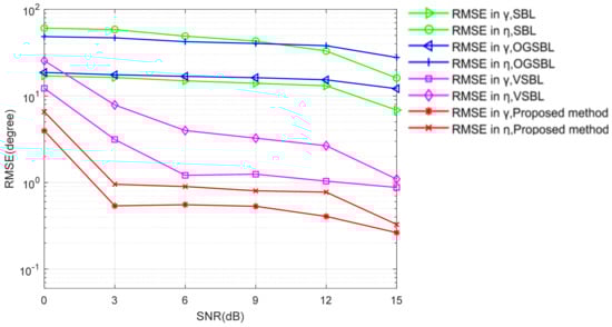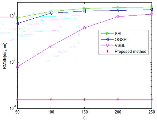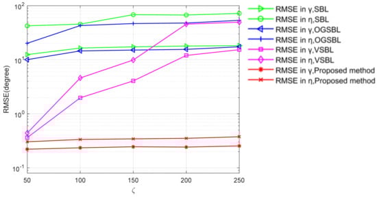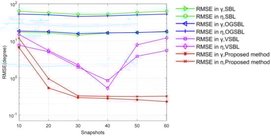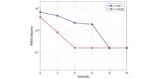 Figure 11 and Figure 12 present a comparison of the DOA RMSE of the proposed method versus SNR and snapshots under different , respectively. In Figure 11, the number of snapshots is fixed to 20. In Figure 12, the SNR is fixed to 3 dB. It is obvious that the DOA RMSE performance improves as the SNR and snapshots increase. On the other hand, the RMSE will rise when the is larger. In other words, the higher the probability of bad data, the lower the estimation accuracy.