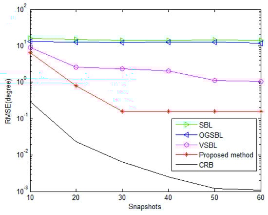 RMSE versus the number of snapshots under different (SNR = 3 dB).