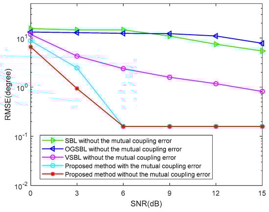 To further verify the robustness of the proposed method, two cases of array element position error and array element mutual coupling will be considered in the following simulation. Figure 15 illustrates the DOA RMSE versus SNR while the snapshots are 20 in the condition of the array element position error, and the element position error is randomly chosen by . It can be seen in Figure 15 that the RMSE of the proposed algorithm with the element position error is only slightly lower than that without the element position error. Moreover, the RMSE of the proposed algorithm is much lower than that of the other three algorithms without the element position error. This fully shows that the proposed algorithm can still maintain relatively high estimation accuracy under the influence of the element position error, thus proving that the proposed algorithm is relatively robust. Figure 16 illustrates the DOA RMSE versus SNR, while the snapshots are 20 in the condition of array element mutual coupling. In this simulation, it is assumed that only the linear array placed along the z axis has a mutual coupling effect, and the three linear arrays are far apart due to curvature; therefore, the mutual coupling effect between the linear arrays is ignored. When the mutual coupling matrix is set to ; it is obvious to see that the RMSE of the proposed method is close to that of the proposed method without considering the mutual coupling. The above experiments demonstrate the robustness of the proposed method. When the SNR is higher, the mutual coupling error has almost no effect on the proposed algorithm, which further proves that the proposed algorithm has strong robustness.