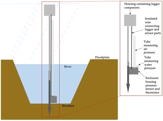 The sensor was designed to be as simple as possible in terms of construction and deployment. To produce a truly ‘low-cost’ sensor, parts were chosen based on their quality as well as their price (Table 1). More detailed instructions for construction are available at https://github.com/rhpearce/waterdepthsensor (accessed on 9 April 2024). Due to the challenges of waterproofing DIY sensors, the sensor design is orchestrated to have a submersible sensor part and a non-submersible housing part (Figure 1). The non-submersible part was elevated to beyond the known atypical extreme water level. In this deployment, the submersible sensor was held 2.5 m from the riverbed bottom, which was determined from winter aerial imagery and LiDAR data to identify the active floodplain as historical water level data were not available for the research area. To prevent water intrusion into the non-submersible housing, an enclosure with a high IP rating was chosen (RS PRO ABS General Purpose Enclosure, IP65, Light Grey; RS PRO, RS Components Ltd., Birchington Road, Corby, Northamptonshire NN17 9RS, UK, Manufactured in China). Here, the design was targeted for a wadeable, soft sediment riverbed, but could be adapted for other conditions depending on need. For example, for deeper rivers, the post could be attached to a concrete block to weigh it down at the bottom of the riverbed. For this deployment, however, the main logger housing was attached to a bracket (Angle aluminium, metals4U Ltd., Armitage Works, Sandbeck Way, Wetherby LS22 7DN, UK) which was screwed to a threaded bar (M10 steel threaded bar; Easyfix UK, Galway, Ireland), which was then attached to a sharpened angle iron base. Each angle iron base (metals4U Ltd, Armitage Works, Sandbeck Way, Wetherby LS22 7DN, UK) was cut based on the water depth measured in summer 2021, and an additional 50 cm was added to achieve anchorage in the sediment, which was mainly silt–sand and created its own stability due to the cohesive and adhesive forces between the water and sediment (see Section 2.5), comparative to a gravel or boulder bed stream. A parts list for deployment structure is listed in Table 2.