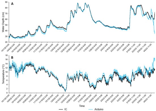 For water temperature, the Arduino-based logger shows a closer agreement to the IC: 8.82 ± 3.12 °C for mean water temperature compared to the IC with 8.02 ± 3.13 °C. The water temperature for the Arduino-based logger shows a lower CV at 35.37% compared to the IC at 38.95%. The mean absolute error for the Arduino-based logger’s water temperature readings is 0.83 °C (or ±0.415 °C), with a relative error of 0.12. The RMSE was 0.88 °C. The high correlation and low mean absolute error, RMSE, and relative error would evidence high accuracy for the Arduino-based logger, but Figure 5B and Figure 7 show some issues.