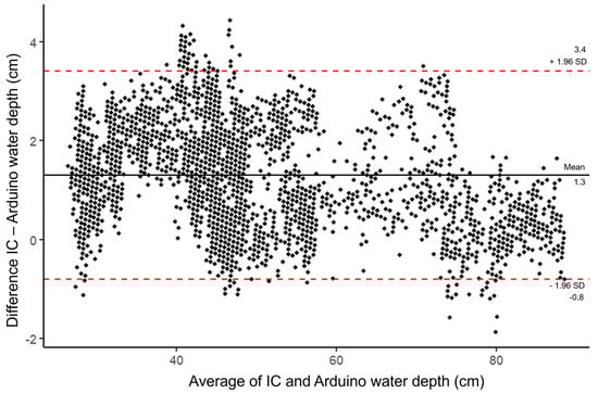 Mean difference in measurements between the industrial comparison (IC) and Arduino-based logger against the average measurement for each record of water depth (cm) and significant difference intervals (SD).