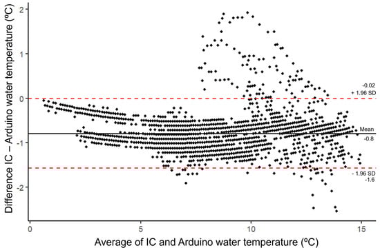 Figure 7 shows a Bland–Altman plot displaying the systematic difference between the IC and Arduino-based measurements for water temperature. Overall mean difference between the IC and Arduino-based loggers is low, −0.8 °C, which suggests that compared to the IC, the Arduino-based logger tends to overestimate. The range of the significant difference bounds is less compared to water depth, giving confidence that the methods are interchangeable. This could, however, relate to the narrower range of temperature data: 0.6 to 14.4 °C. Both significant difference bands are below zero, which would suggest that there is general trend for the Arduino-based logger readings to be greater than those of the IC. There seems to be a weak trend that overestimations are lower with lower temperatures. This trend is weakened, however, by a non-even distribution of points outside of the significant difference bounds above ~8 °C. This suggest that while some readings tend to overestimate within a predictable range, some readings, almost randomly overestimate and underestimate higher temperatures.
