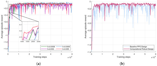 Figure 3b provides a clear comparative analysis of the performance between the PPO method with the robust design computations and the non-robust method. The computationally robust PPO algorithm, as proposed in this paper, is observed to achieve higher and more stable overall rewards compared to the baseline PPO algorithm. This improved performance is largely attributable to the computationally robust strategies.