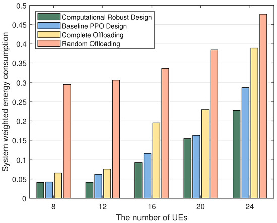 Figure 4 provides an in-depth comparative analysis of the changes in system-weighted energy consumption for four distinct methods across varying user scales. It is observed that the PPO algorithm, designed with a focus on computational robustness as proposed in this paper, outperforms others in terms of efficiency. The system’s average weighted energy consumption under various user sizes is found to be lower when employing this algorithm, in contrast to the baseline PPO approach. Moreover, it is noted that the energy consumption resulting from strategies such as complete offloading or random offloading is significantly higher, which substantiates the effectiveness of incorporating partial offloading strategies based on offloading ratio in the joint optimization process, thereby effectively reducing system energy consumption and enhancing performance. Additionally, an upward trend in average energy consumption between adjacent user numbers is observed in Figure 4. This increase is attributed to the growing number of users accessing the network, which escalates signal interference among users, reduces transmission rates, and consequently raises transmission costs. Such developments lead to a decrease in the volume of tasks offloaded to BS and an increase in locally computed tasks, necessitating greater computational resources from users and ultimately resulting in a rise in system energy consumption.