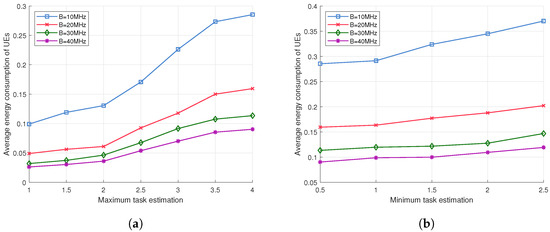 Energy consumption in different bandwidths and task estimation. (a) Performance comparison of different maximum task volumes and bandwidth; (b) performance comparison of different minimum task volumes and bandwidth.