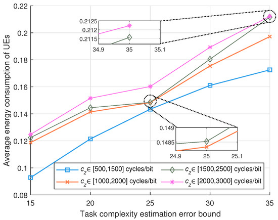 Figure 6 shows the influence of estimation error bounds and task complexity on performance. It is evident from the figure that when the estimation error bound increases, the energy consumption rises. This is attributed to the fact that a bigger error bound results in better uncertainty in the calculations.