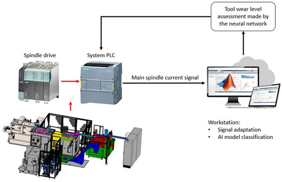 A schematic overview of a proposed tool condition monitoring system using AI to assess tool wear based on the spindle electric current signal.